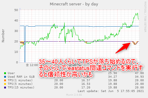 - TPS状況はサーバースペックページの下の方に5分毎に更新されるグラフがあるので、そちらも参照してください。現時点ではプレイヤー数が35人を超えたあたりからTPSが減っているグラフが確認できると思います。34人の時に自分の拠点に移動しTPSが上がれば、負荷を掛けている可能性が高いと思われるので、減らす努力をお願いします。