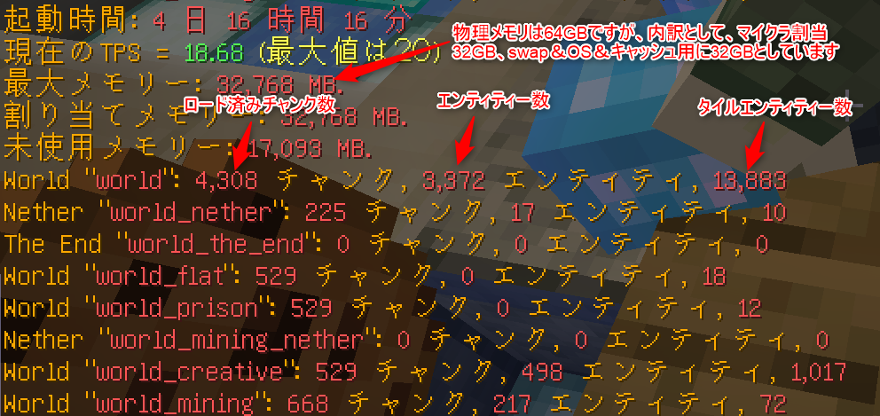 - 稼働日数、瞬間tps、メモリ状況、ロード済みチャンク数、エンティティー数、タイルエンティティー数を表示します