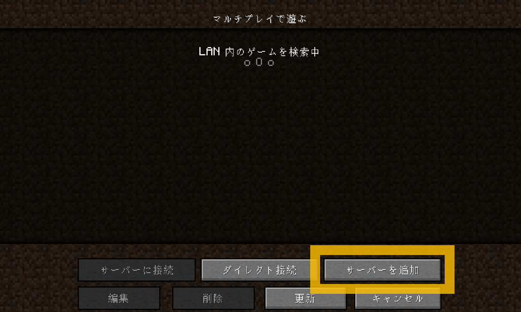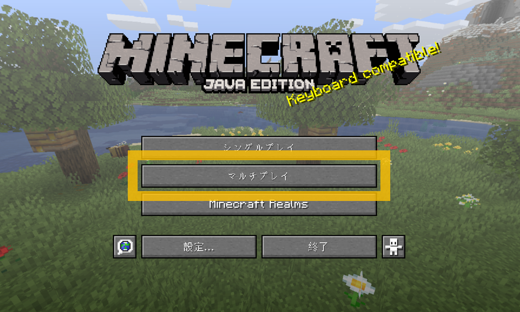 - ① マインクラフトを起動して、タイトル画面の「マルチプレイ」を選択する。