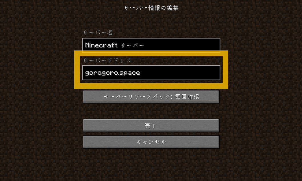- ③ サーバーアドレスに「gorogoro.space」と入力して、「完了」ボタンを押す。